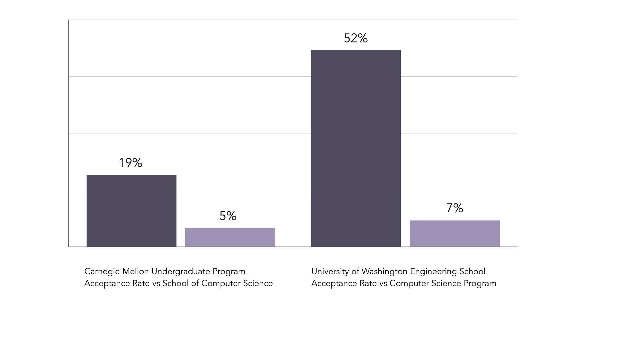Since 2008, computer science enrollments have exploded, more than tripling by 2015, and continue to skyrocket. As an example, the University of Wisconsin-Madison saw an 800% increase in computer science majors in one decade, growing from 200 to over 2,000 students from 2011 to 2021. The Paul G. Allen School of Computer Science and Engineering at the University of Washington experienced an over 400% increase in interest in a similar time frame. Unsurprisingly, it has become increasingly competitive to gain admission to schools as a computer science major.